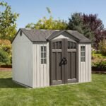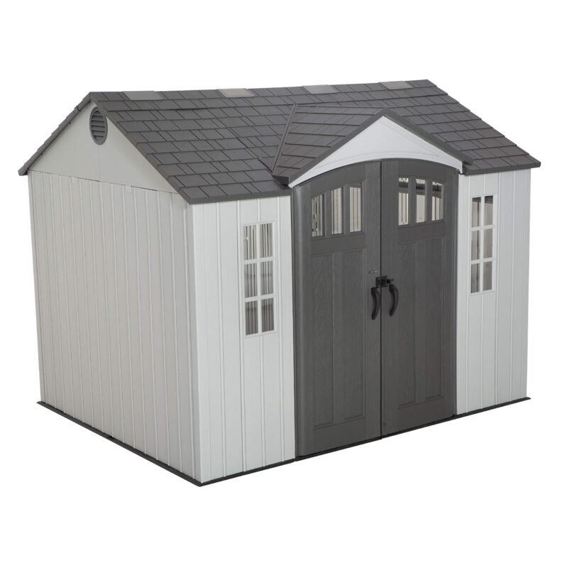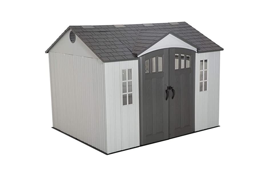 The 10-foot wide Sheds from Lifetime Products give you that extra space needed while accenting the beauty of your backyard. The centralized location of the doors provides easy storage access and the decorative shutters, molded wood-grain panels, and simulated shingled roof ensure an attractive design that will be the envy of your neighborhood.