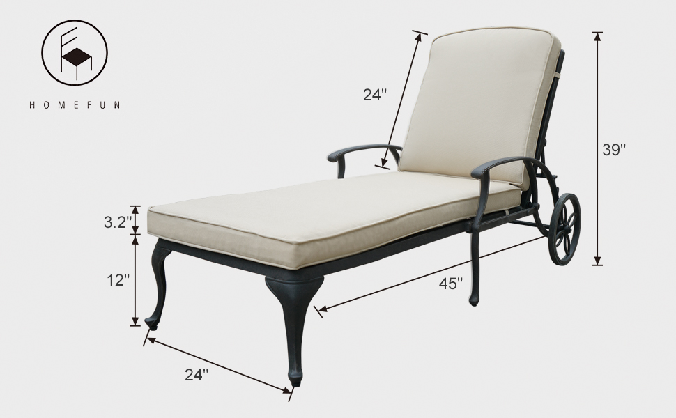 As an elegant and classic touch to your outdoor space, this HOMEFUN cast Aluminum Chaise Lounge combines the appearance, function and quality all together, offering you with the best experience. When having a conversation, reading a book, or just simply enjoying the sun, this deep seating outdoor lounge help you sink in comfort and style. Whether in backyard, patio, deck or garden, you’ll enjoy this piece for years to come.