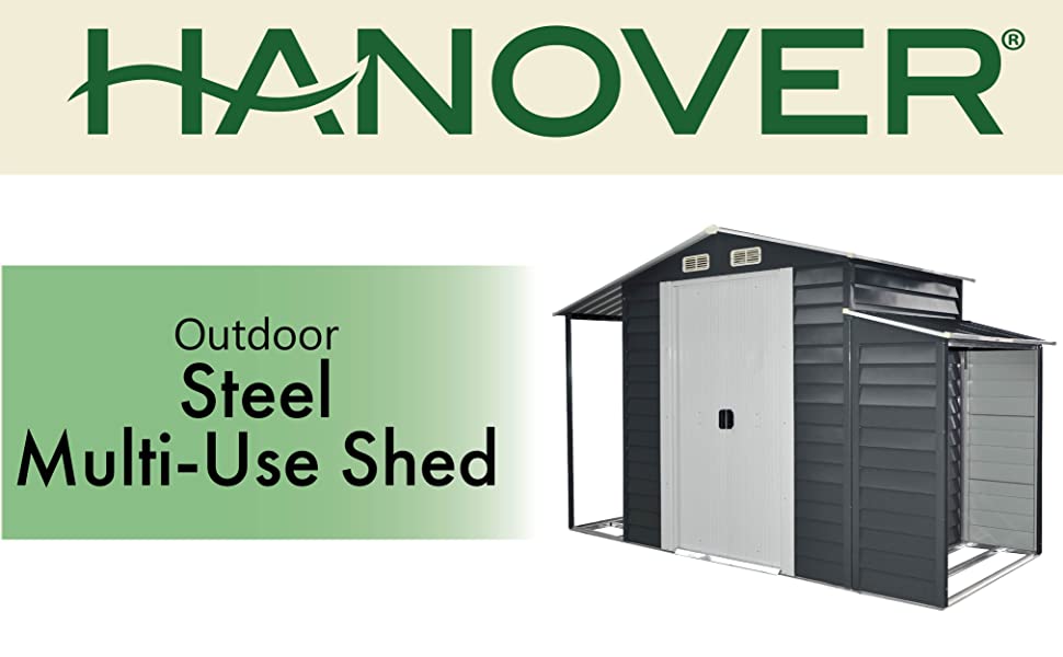 Keep everything organized in one place with this convenient 3-in-1 multi-use storage shed by Hanover. Our 3-in-1 marvel includes lockable storage, firewood storage, and an open extension to use as you see fit. Strong and durable, this stylish shed is constructed with powder-coated, galvanized steel which is resistant to rust, corrosion, and UV rays. The apex roof design allows efficient water runoff and is tall enough for an adult to stand and walk around with ease. Sliding double-doors open fully to allow easy access, and the door handles have padlock eyes to accommodate most combination or keyed locks (padlock NOT included). Plus, the connected woodshed provides the ideal location to season and store your firewood, holding up to 42 cubic feet of stack firewood. For all your outdoor storage needs, depend on quality products from Hanover.