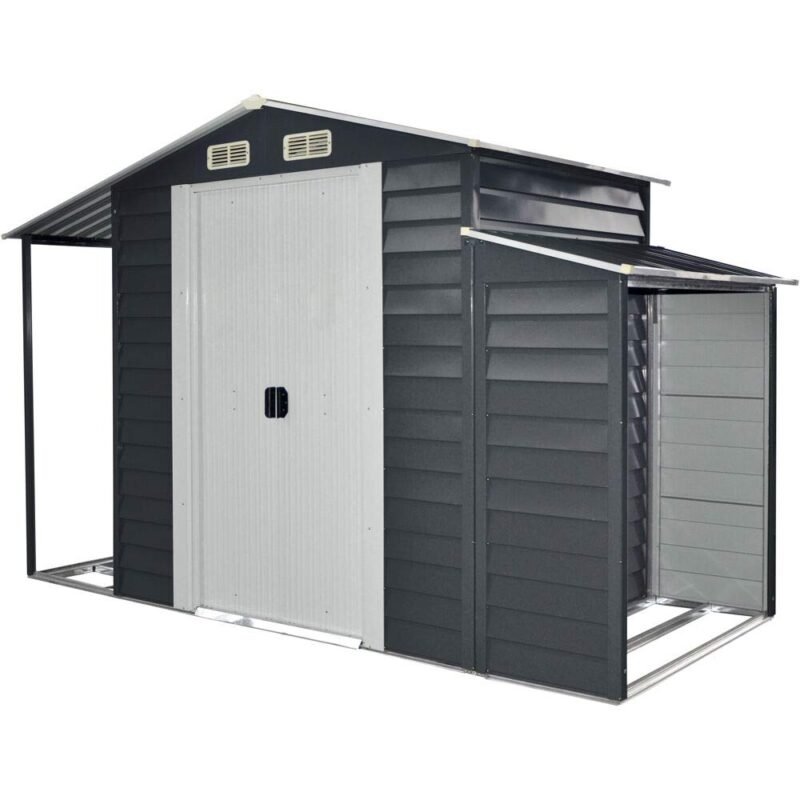 Keep everything organized in one place with this convenient 3-in-1 multi-use storage shed by Hanover. Our 3-in-1 marvel includes lockable storage, firewood storage, and an open extension to use as you see fit. Strong and durable, this stylish shed is constructed with powder-coated, galvanized steel which is resistant to rust, corrosion, and UV rays. The apex roof design allows efficient water runoff and is tall enough for an adult to stand and walk around with ease. Sliding double-doors open fully to allow easy access, and the door handles have padlock eyes to accommodate most combination or keyed locks (padlock NOT included). Plus, the connected woodshed provides the ideal location to season and store your firewood, holding up to 42 cubic feet of stack firewood. For all your outdoor storage needs, depend on quality products from Hanover.