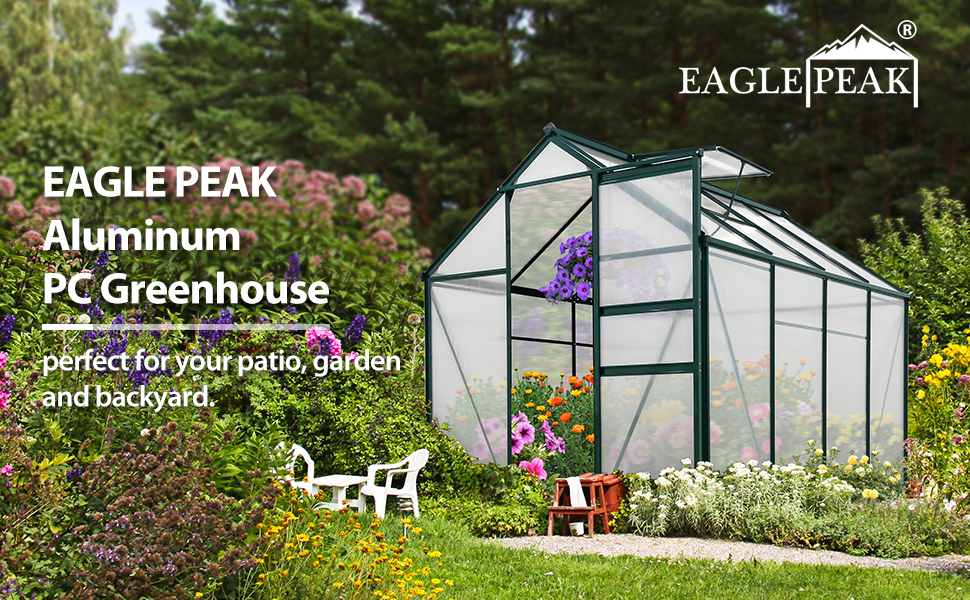 The EAGLE PEAK aluminum alloy greenhouse is perfect for year-round gardening. It is made of a heavy-duty powder-coated aluminum frame and 4MM twin-wall polycarbonate roof panels. Includes one adjustable rooftop vent with 5 adjustable angles and one sliding door for better ventilation. The unique galvanized metal base with integrated corner ground anchors adds extra support. This greenhouse helps you extend the growing season of your plants, flowers, vegetables, and herbs.