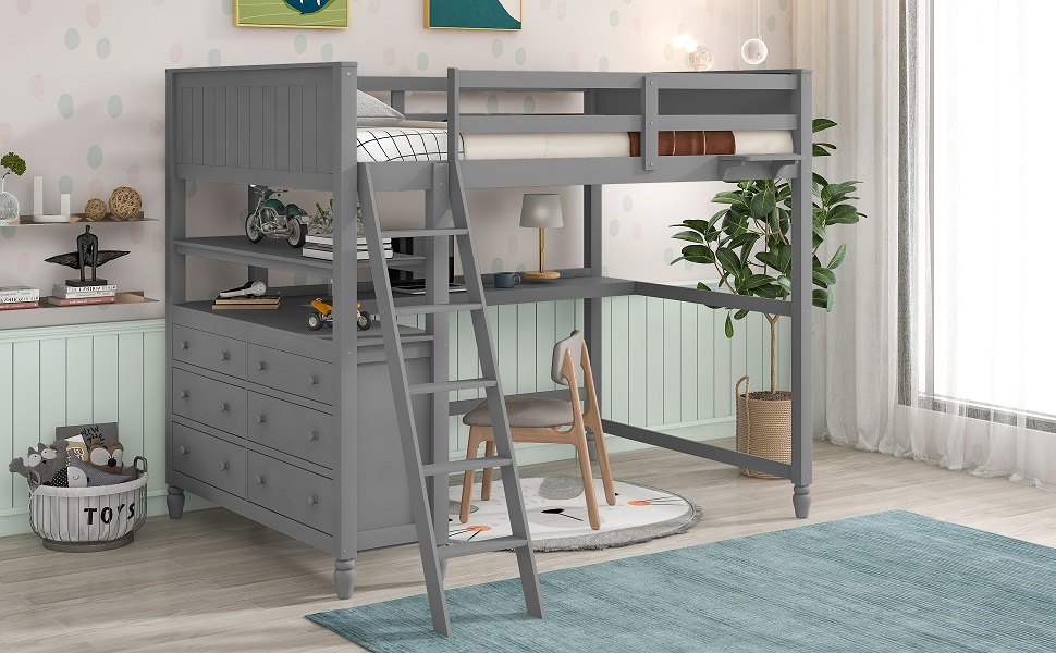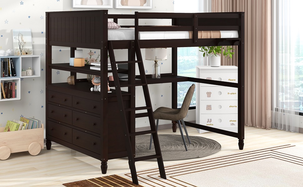 Loft Bed with Desk: The space underneath the full size loft bed is a good place for you to read, do homework or play and create their own world to be explored. Coming with drawers and desk, the loft bed helps to store books, display decorations, or to place a laptop.