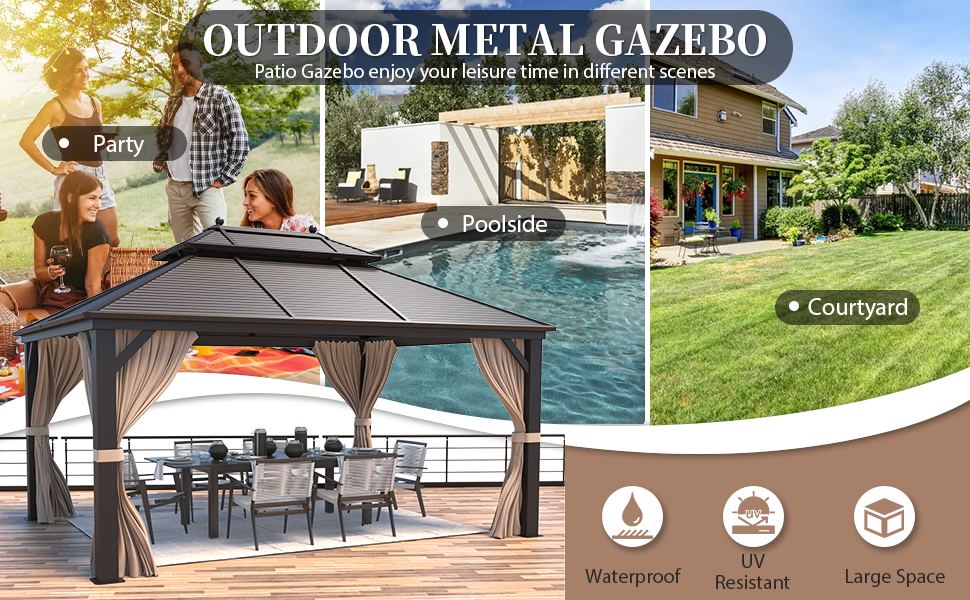 【DOUBLE TOPS DESIGN】- Outdoor gazebo has ventilated double tops provide safety from harmful UV rays while the unique design allows wind to pass through.Hardtop gazebos for patios can tolerate high summer temperatures and withstand UV rays, provides you plenty of cool shade to enjoyment.