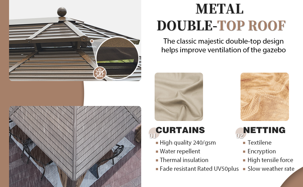 【NETTING & CURTAINS】- Fully enclosed zippered double layer sidewall protect you from UV rays while adding more privacy.Gazebo canopy also has a double track system which allows you to slide each layer with ease.Netting zipper at four sides to give your family and children safe and cozy surroundings.