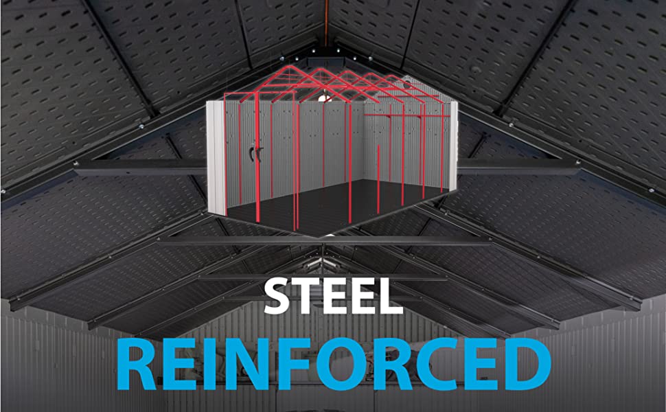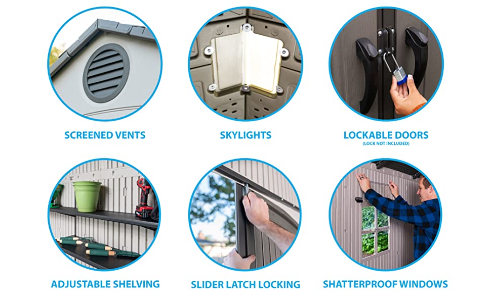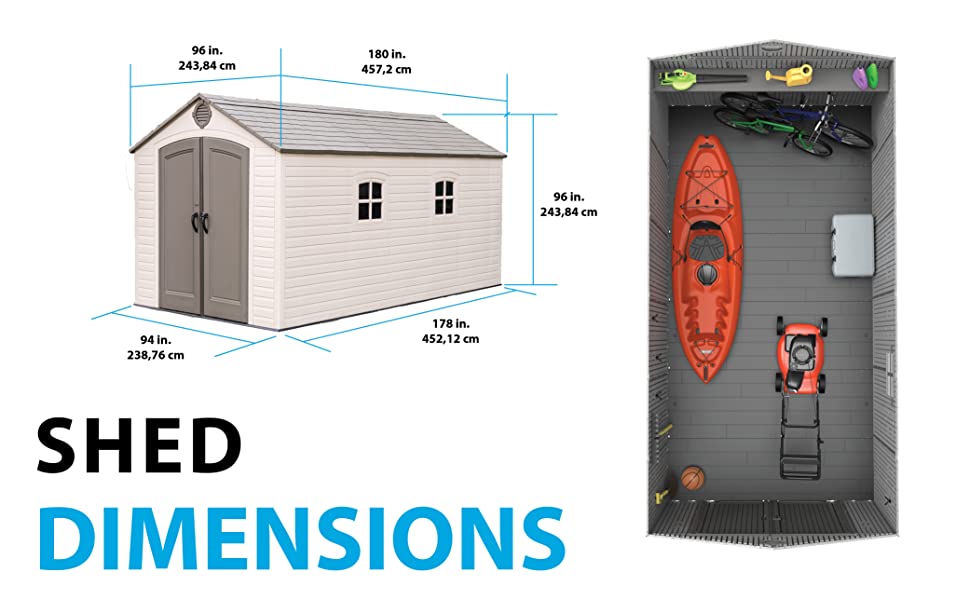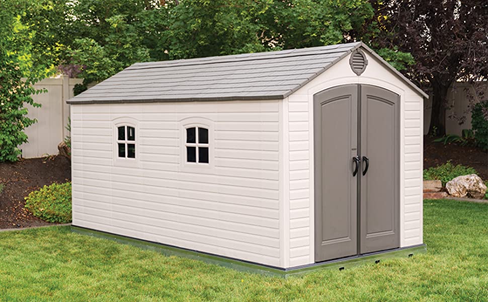 The Lifetime 8 ft. x 15 ft. Outdoor Storage Shed features: (5) small skylights, (2) shatter-proof impact-resistant windows, (2) screened vents, (1) 90 in. x 9 in. shelf, (2) 30 in. x 10 in. shelves, (2) corner shelves, and a 10-year limited warranty. Floor and installation hardware included. Comes in (3) boxes.Lifetime’s 8-foot wide Outdoor Storage Sheds are the perfect solution to your storage needs. Built with durable, dual-wall high-density polyethylene, our sheds are steel-reinforced and low-maintenance. With various features including shatter proof windows, skylights, custom shelving, and much more, a Lifetime Shed is the perfect addition to your backyard.