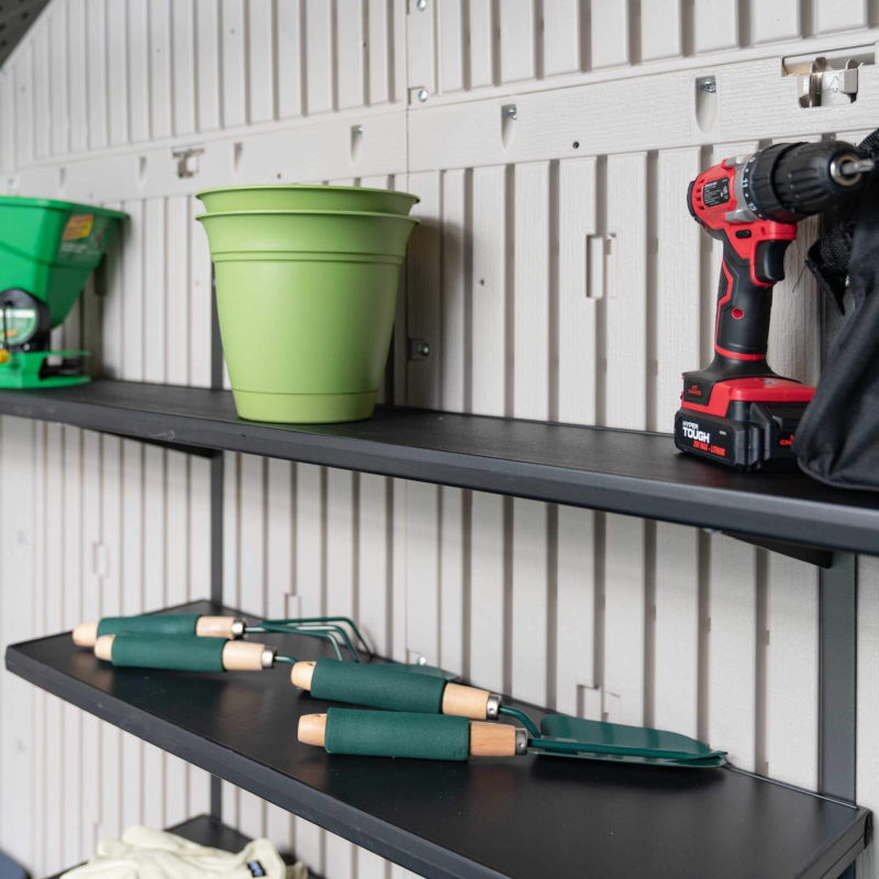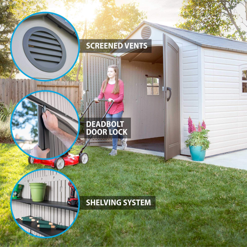 The Lifetime 8 ft. x 15 ft. Outdoor Storage Shed features: (5) small skylights, (2) shatter-proof impact-resistant windows, (2) screened vents, (1) 90 in. x 9 in. shelf, (2) 30 in. x 10 in. shelves, (2) corner shelves, and a 10-year limited warranty. Floor and installation hardware included. Comes in (3) boxes.Lifetime’s 8-foot wide Outdoor Storage Sheds are the perfect solution to your storage needs. Built with durable, dual-wall high-density polyethylene, our sheds are steel-reinforced and low-maintenance. With various features including shatter proof windows, skylights, custom shelving, and much more, a Lifetime Shed is the perfect addition to your backyard.