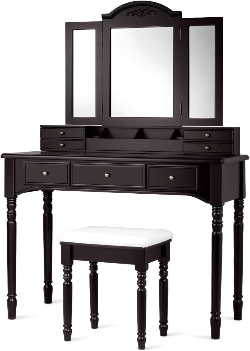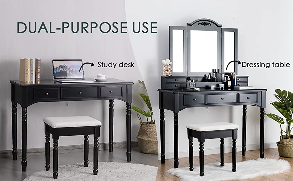 🌼【Selected Materials for Durable Use】: The legs of dressing table and stool are made of solid wood to ensure the sturdiness and provide large weight capacity. This dressing table set will provide long time service for you. Painted with environmentally friendly coating, the set has no horrible smell and the surface is scratchproof.