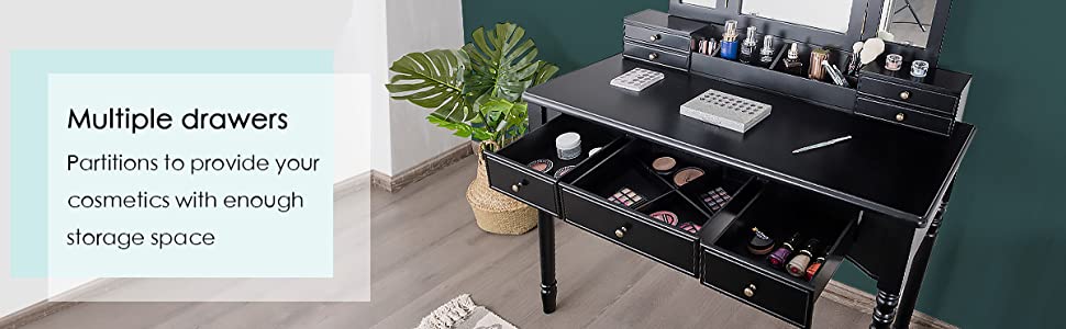 🌼【7 Drawers & 6 Desktop Makeup Organizers】: Designed with 7 drawers, 6 desktop organizers, 2 DIY drawer dividers, large smooth tabletop, this vanity set can provide you with a lot of space to store your cosmetics, lotions, perfumes, brushes, hair accessories and other beauty essentials.