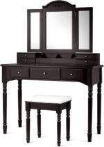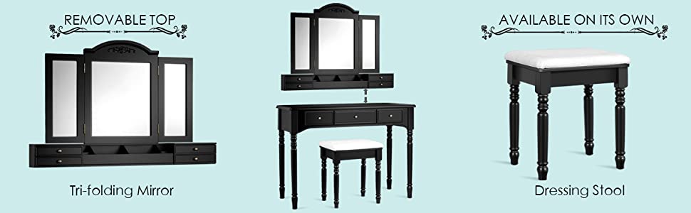 🌼【180° Tri-Folding Mirror with 8 Hooks】: The mirror of this makeup vanity table is tri-folding and 2 sides of the mirror can be opened in line with middle one. And you can adjust the angle of mirror to meet your need. When the mirror is closed, you will find 8 hooks on the back of the mirror to store necklaces.