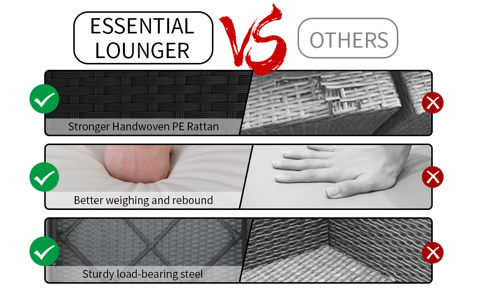 【Strong & Sturdy】ESSENTIAL LOUNGER’s structure of the outdoor patio furniture set includes two main parts. One is the solid anti-rust steel frame which is made of powder-coated heavy-duty metal, enhancing the stability considerably. The second part is the PE rattan which is synthetic manual wicker. This kind of rattan wick is more sturdy and durable than others, you can use it long time.