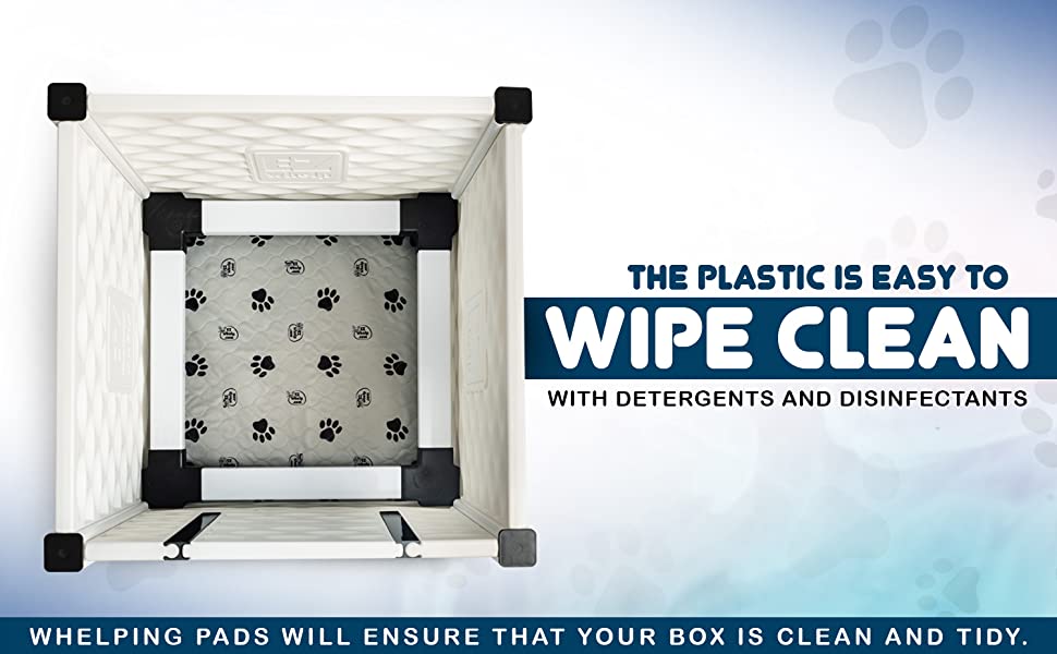 Our whelping boxes are easy to wipe clean with general-purpose detergents and disinfectants, including bleach. We include our reusable and absorbent pet pee pad and heavy duty canvas whelping box liner, which are water-resistant and machine washable.