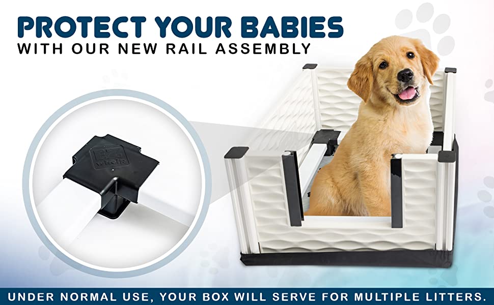 KEEP YOUR HOUSE IN ORDER: It’s hard to stop newborn puppies from causing havoc, so keeping them contained is critical. Small, medium, and large dogs all need a comfy bed and safe place to recover. Our whelping box for dog birth provides both! Our EZclassic Whelping Box is sold with our new rail assembly, front panel with 2 pc door to prevent puppies from escaping, one washable & reusable pet or puppy pee pad, and one heavy duty canvas floor liner. Wall panel height = 18 inches.