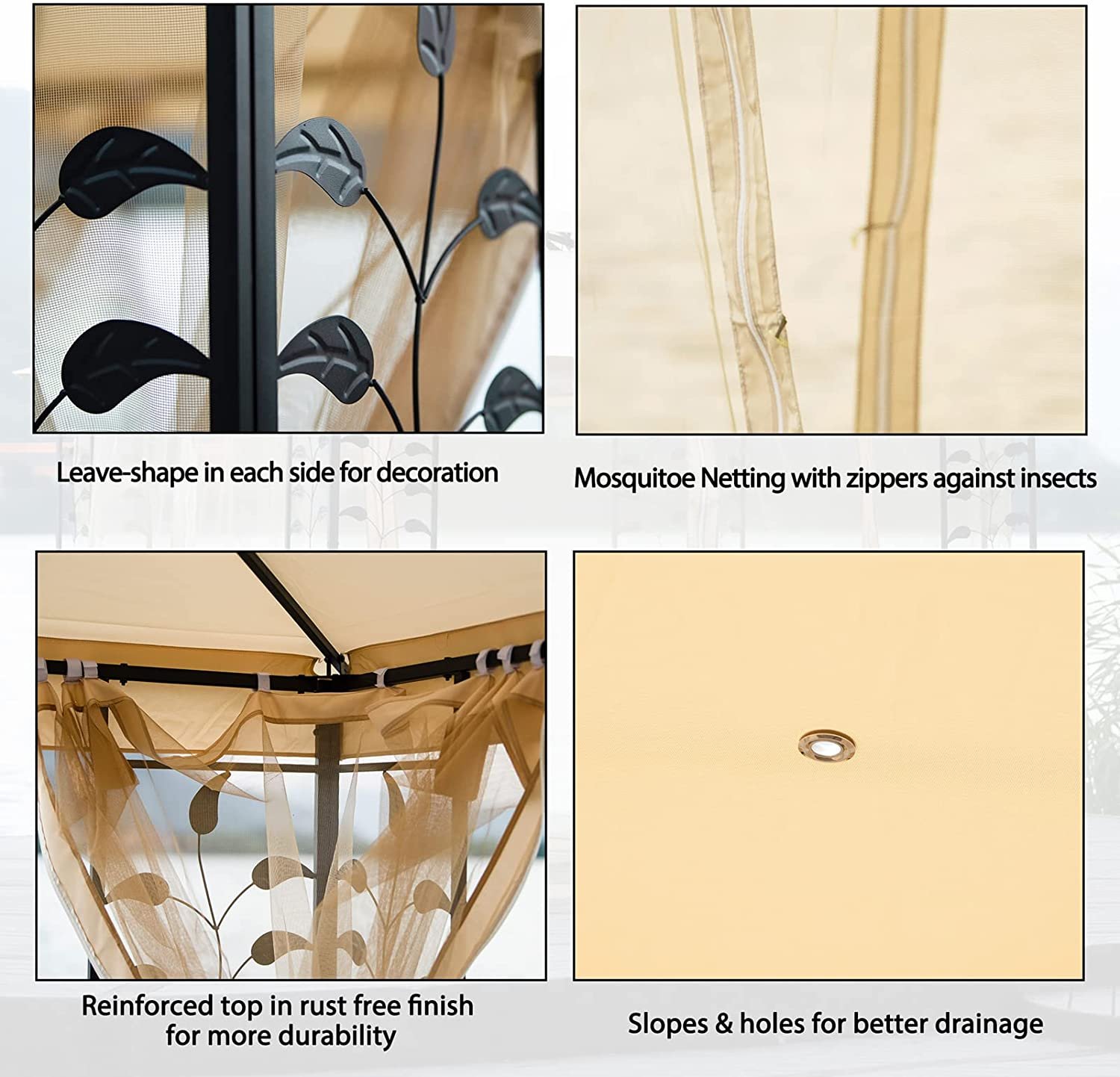 😁【Sturdy Quality&Stylish Frame】Constructed with power-coated steel frame, the gazebo frame is sturdy enough to avoid rust-resistant as well as peeling in the outdoor environment. 8 piece stakes in total for stability. Made from high quality polyester, the cover roofs are UV-resistant with UPF 50+ and fire-retardant. Leaf-shape panels in four sides add an sleek silhouette for the gazebo while decorating your backyard with natural style.
