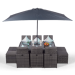 - The Giardino Cube rattan dining set lets you enjoy outdoor dining without sacrificing style or space. Featuring a 182x120cm rattan dining table, 6 rattan dining chairs, 4 stools, and a 3x2m parasol, this compact outdoor dining set can seat up to 10 people and neatly stores away within the parameters of the dining table. The rattan dining chairs feature flip-up backrests with seat and back cushions, whilst the padded stools allow you to accommodate additional dinner guests or to put your feet up and relax.