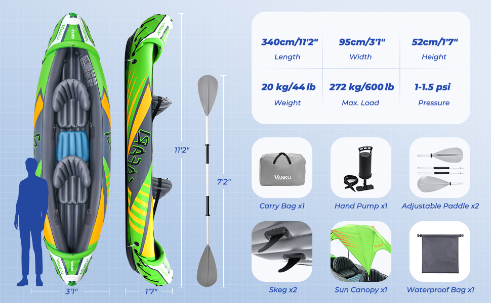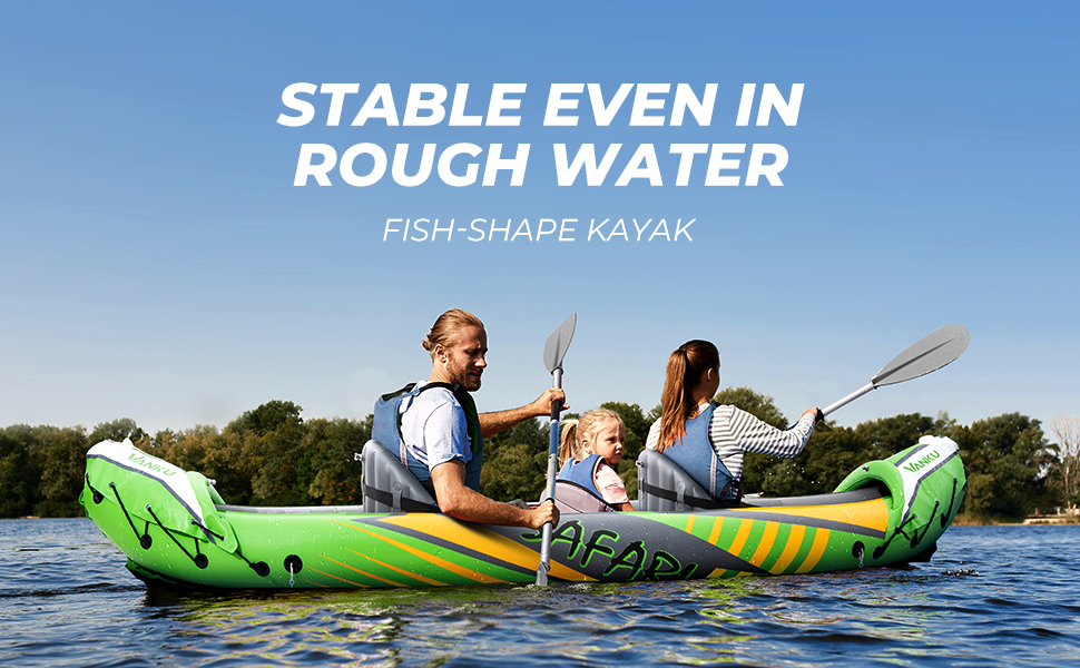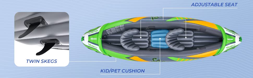 【Room for 2 Adult and 1 Kid / Pet】The inflatable kayak has a load capacity of 272kg(600lbs). The 2 inflatable seats are adjustable and detachable, allowing you to adjust the seat to the most comfortable Angle as needed. With a removable cushion in the middle, you can bring your puppy or kid to enjoy the beautiful lake scenery with you together. Note: Please be sure to wear life jackets on the kayak!