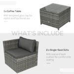 - RECONFIGURABLE DESIGN: This modern 3 pieces outdoor furniture set comes with two single sofa and a tempered glass top coffee table, offers flexible layouts and combinations