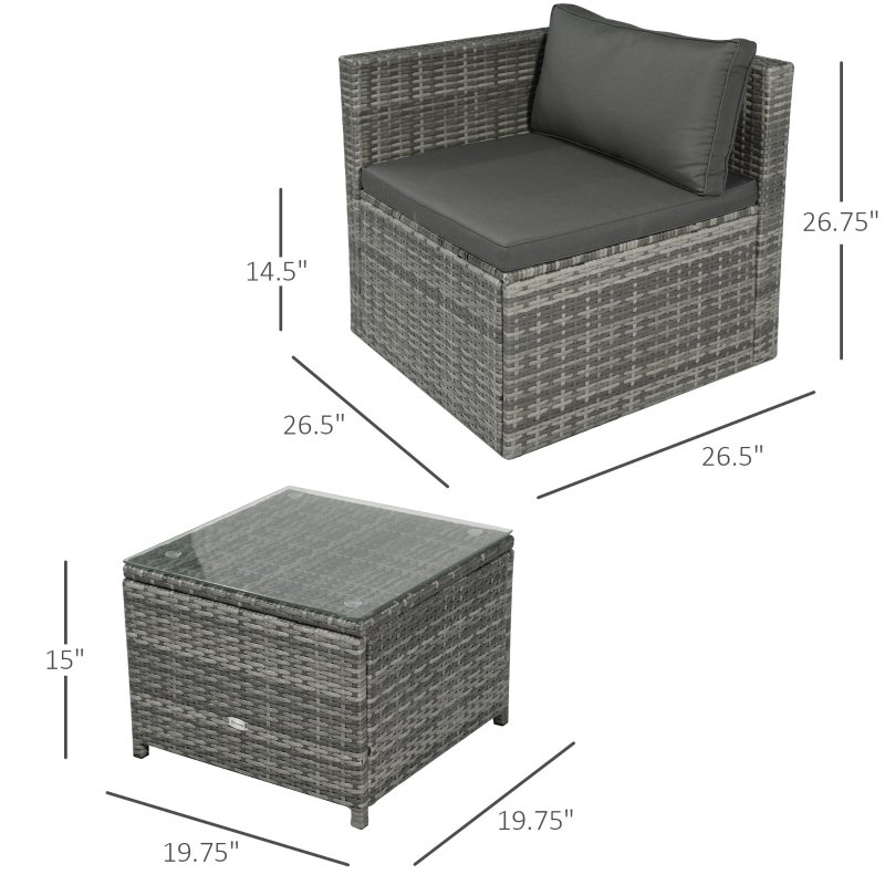 Brighten it with this Outsunny 3pc Outdoor Patio Furniture Set and make the outside of your home just as inviting as the inside! Woven of durable PE material that replicates the look and feel of traditional wicker but is more resistant to sun, rain, heat and cold outdoor weather condition use. Soft padded seat and back cushion included provide extra comfort, ready to use and low maintenance allows you to enjoy your garden life.