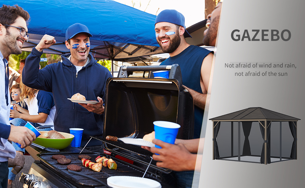 【High-Quality Materials】Our hardtop, all-weather gazebo boasts a strong, powder-coated and rust-proof iron roof that is highly-durable, UV-resistant and water-proof. It comfortably provides protection from the sun, wind and rain. The structure also includes a solid, heavy-duty, steel frame with triangular supports and large, sturdy feet.
