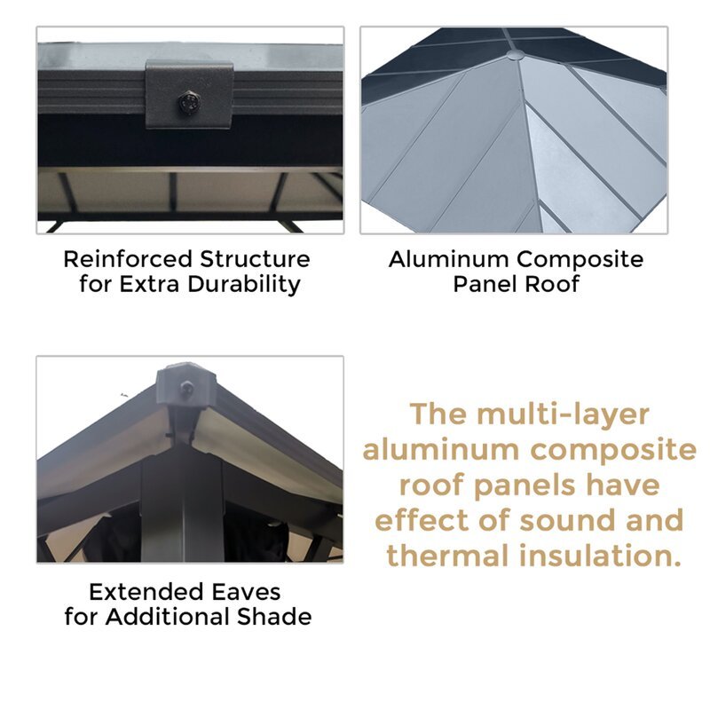 【High-Quality Materials】Our hardtop, all-weather gazebo boasts a strong, powder-coated and rust-proof iron roof that is highly-durable, UV-resistant and water-proof. It comfortably provides protection from the sun, wind and rain. The structure also includes a solid, heavy-duty, steel frame with triangular supports and large, sturdy feet.