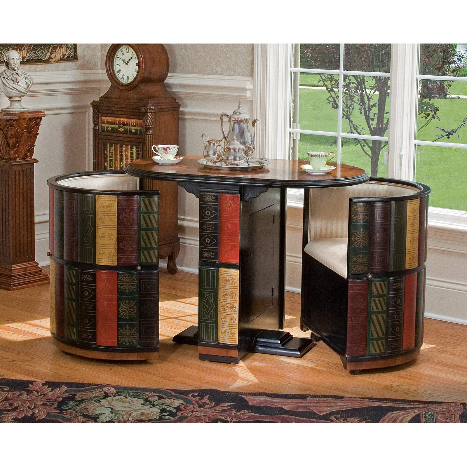 LIBRARY TABLE – In the tradition of European trompe l’oeil, this furniture appears to be a bookshelf but slides apart to reveal a space-saving dining table and two comfy barrel chairs on wheels.