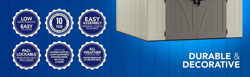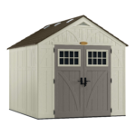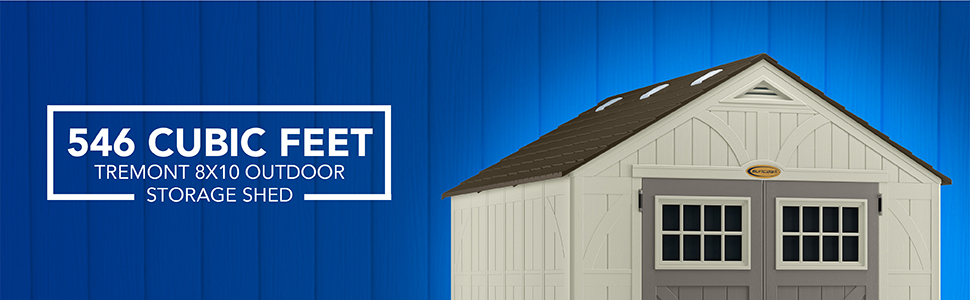 Storage space can be a problem, let the Suncast Tremont Resin Storage Shed be your solution. This large sized 8 ft. x 10 ft. shed offers a spacious capacity of 574 cu. ft. and wide double doors with windows, allowing you to move and store oversized items with ease. The outdoor storage shed is constructed of blow molded resin that is both durable and strong. Resin is easy to clean and will not rust or rot, for an attractive and professional-looking space that will last a lifetime. The roof is engineered from hardened weatherproof plastic and reinforced with a metal truss system built to battle the elements. With 2 windows and 6 skylights, your shed is easily navigated in the daytime with natural light. Also included are 2 corner shelves to optimize storage space and keep your tools organized.