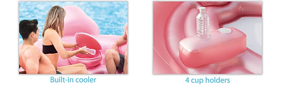 This massive party Island measures 166″ x 147″ x 73″ and is constructed with 20 Gauge vinyl. The built-in cooler and 4 cup holders give you plenty of space for drinks so you can stay hydrated out on the water. The mesh lounging area and detachable boarding platform make it simple to cool off in the water. 7 heavy duty handles make it easier to get out. Includes one anchor bag with a rope and a repair Patch in case things don’t go as planned.