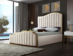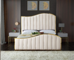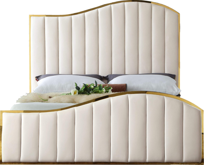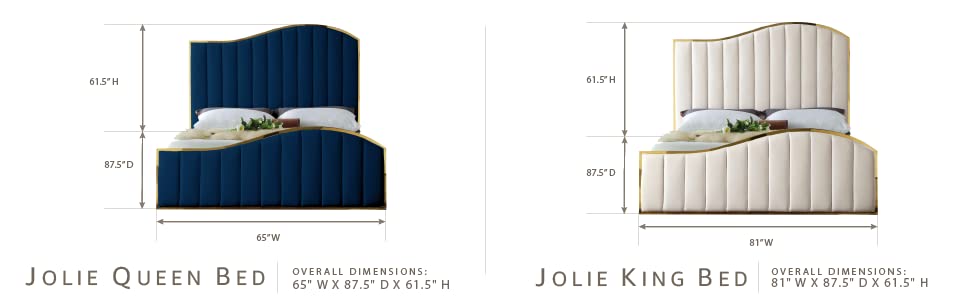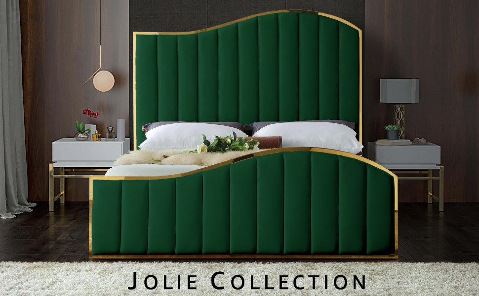 Transform your bedroom into a dream haven with the breathtaking Jolie Velvet Bed. Featuring a stunning polished gold metal frame that supports the plush velvet upholstery on the headboard and footboard with channel tufting for texture, this sleek bed not only commands your attention, it demands it. The wavy design of the headboard and footboard evokes a dramatic image reminiscent of a boat rolling on the waves at sea, promising to lull you to sleep and reward you with a night of pleasant dreams.