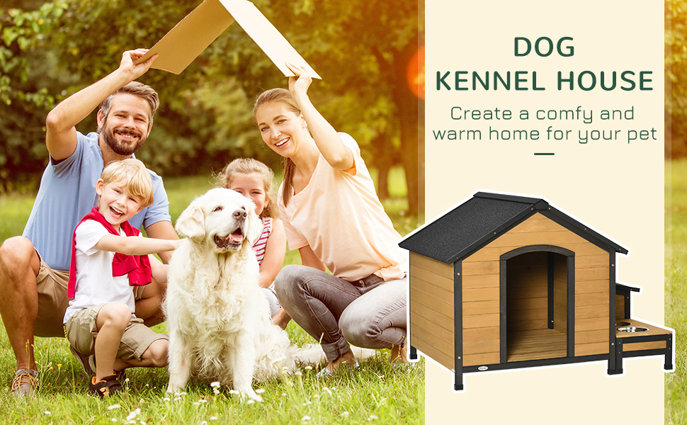 Your dogs are sure to enjoy this Pawhut dog kennel. This cabin-style house with a door has a living room and a bowl holder; your pets will have roomy space to rest while staying away from inclement weather. Inside with doors for easy access and top asphalt roof keeps your dogs protected from the wind, rain, and snow. A spacious front deck to lounge in the sun and have a nap. Stylish and functional, it will surely be a great addition to your backyard, patio, or any space.