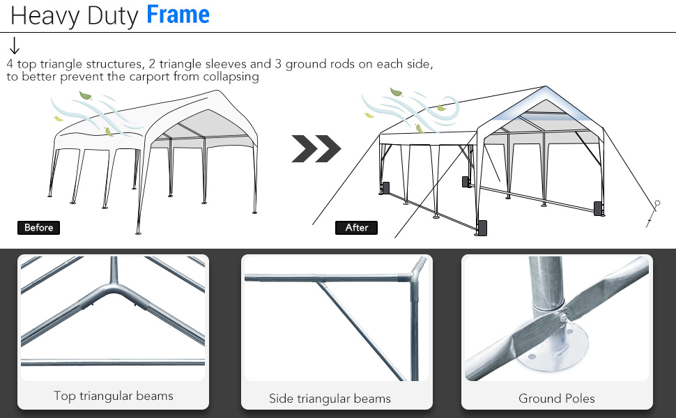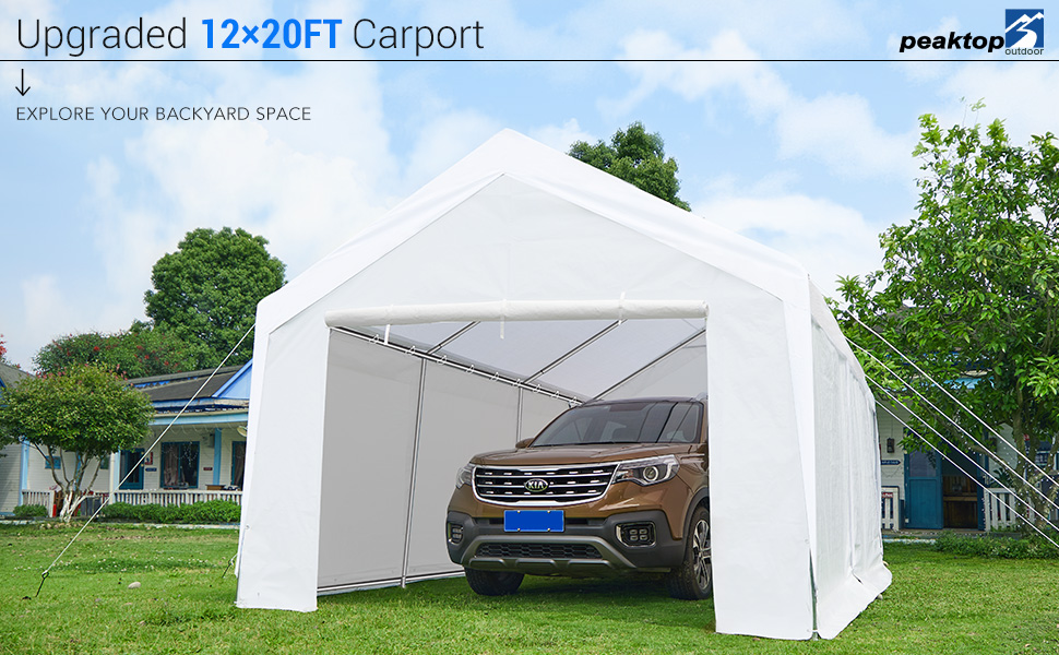 【12×20 FT CARPORT】Compared with a 10×20 carport, the 12×20 heavy duty carport garage has more space to store your vehicles, even trucks and boats. A wider carport allows you to have a wider space to open your car door. It can meet your parking, party, wedding or commercial use.