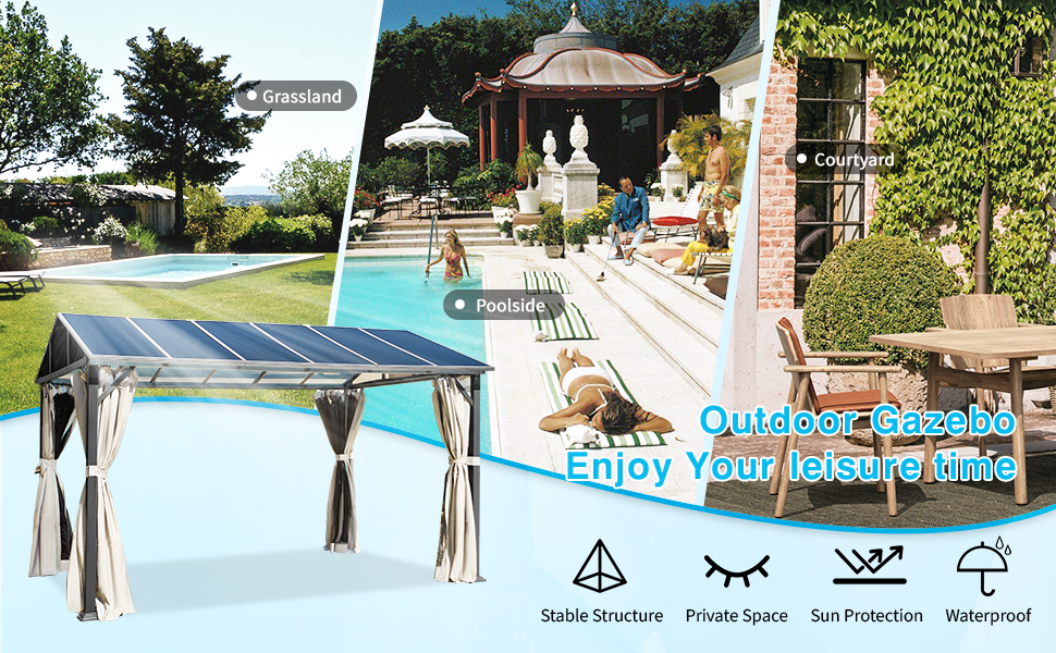 🌞【Heat Resistant Polycarbonate Roof】: Compared with traditional hardtop gazebo, polycarbonate roof gazebos have more beautiful appearance and more transparent characteristics, and will be easier to install. At the same time, because we use high-quality sunscreen coating, which can effectively block the heat, you can fully enjoy the shade under the pavilion.