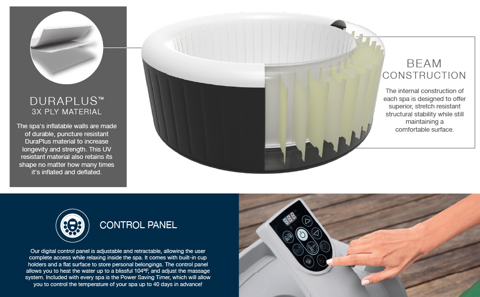 Superior strength and durability: The puncture-resistant tri-tech material and I-beam construction ensures your hot tub never loses its shape and stability even when people sit on the side walls.