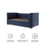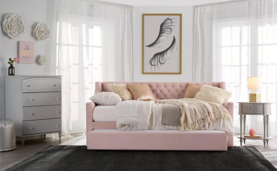 Beautifully upholstered in pink faux velvet with vertically stitched tufting, your little one will be thrilled to call this elegant pink daybed their own. Not only will you and your child both love the look of this chic daybed, the simple, pull out trundle will make sleepovers easy and fun.