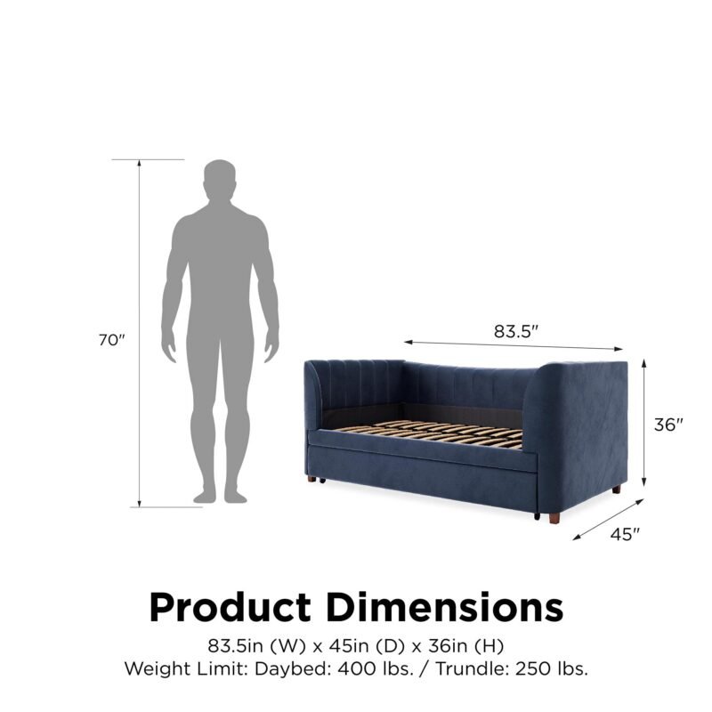 Product dimensions: 83.5”L x 45”W x 36”H. Net weight: 117 lbs. Shipping dimensions: Box 1 – 49”L x 34”W x 9”H. Gross weight: 49 lbs. Box 2 – 78”L x 34”W x 5”H. Gross weight: 89 lbs. Weight limit: Daybed – 400 lbs. Trundle – 250 lbs.