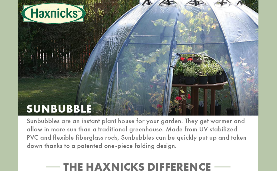 INSTANT GREENHOUSE – Our Haxnicks Garden Sunbubble Greenhouse is an exciting, dome-shaped, instant plant house/conservatory The Haxnicks Sunbubble Greenhouse is easy to set up, easy to move and easy to store Our unique, patented one-piece folding design means you can have a beautiful, quality greenhouse in your garden in just minutes
