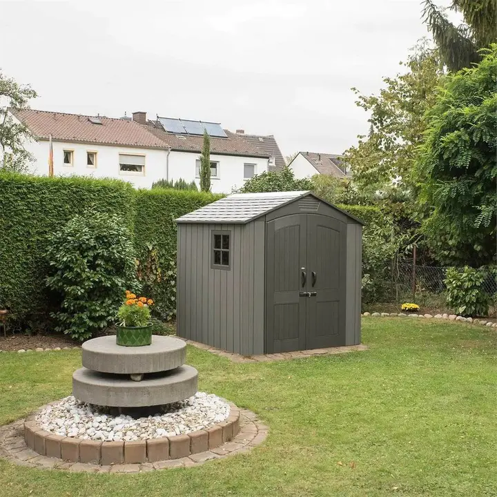 Lifetime’s 7-foot wide Outdoor Storage Sheds have several innovative features, including a skylight that runs the entire length of the roof to maximize natural lighting. They also include single-hinged double doors that open nearly 180 degrees and lock closed, a slip-resistant polyethylene floor, and low-maintenance, steel-reinforced construction.