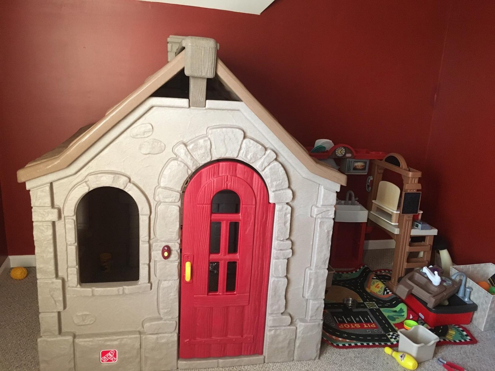 In the box: Playhouse with kitchenette and fold-down table, front door and window shutter set, decals, electronic play phone and doorbell.