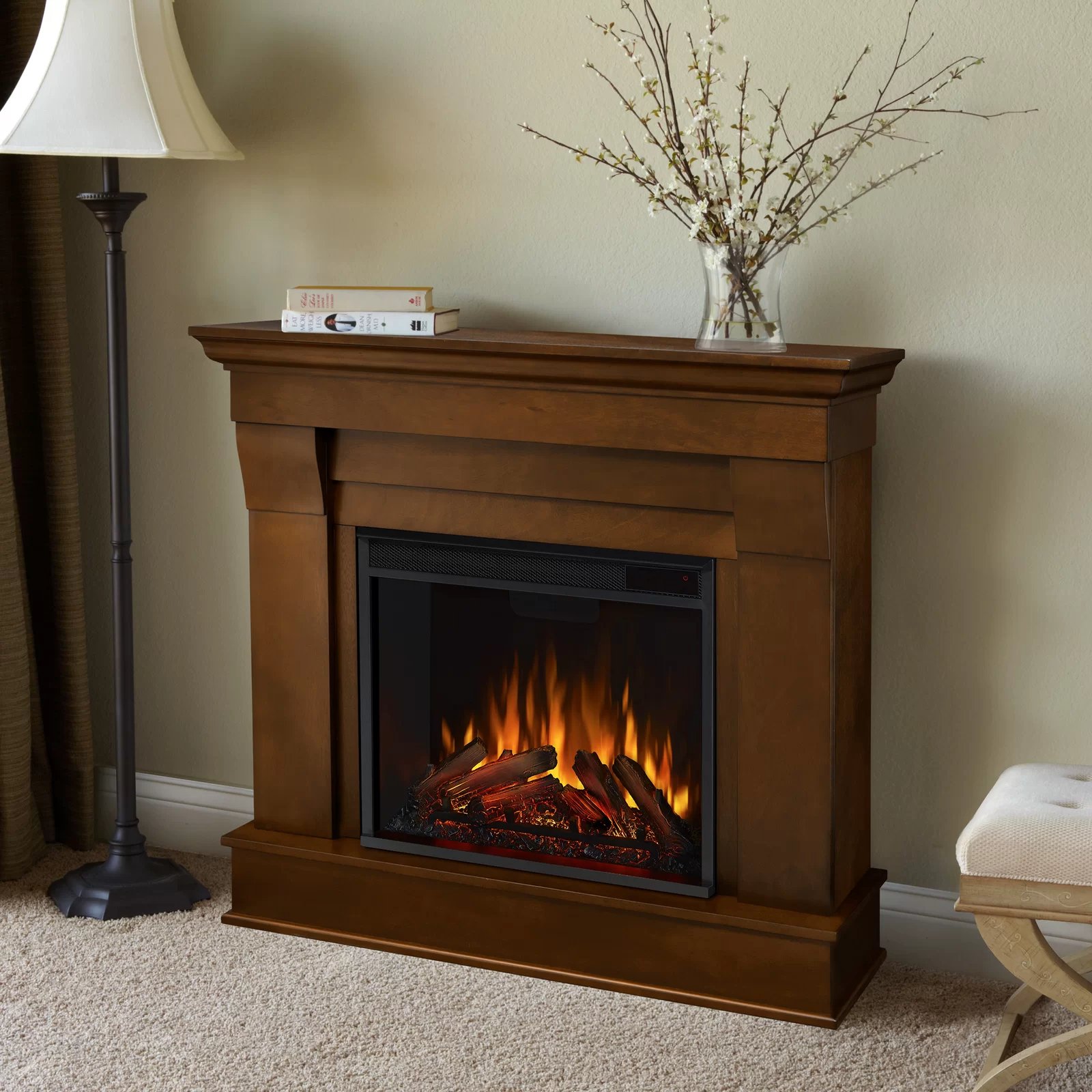 This fireplace has a classic style and a clean, streamlined design making it a stunning addition to any room. The fireplace mimics the look of a real fire but does not require a chimney or vents and plugs into a standard outlet for a convenient setup. Features include infrared LED technology, sleek touch controls, and dynamic glowing embers.