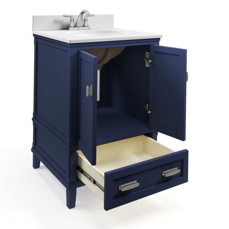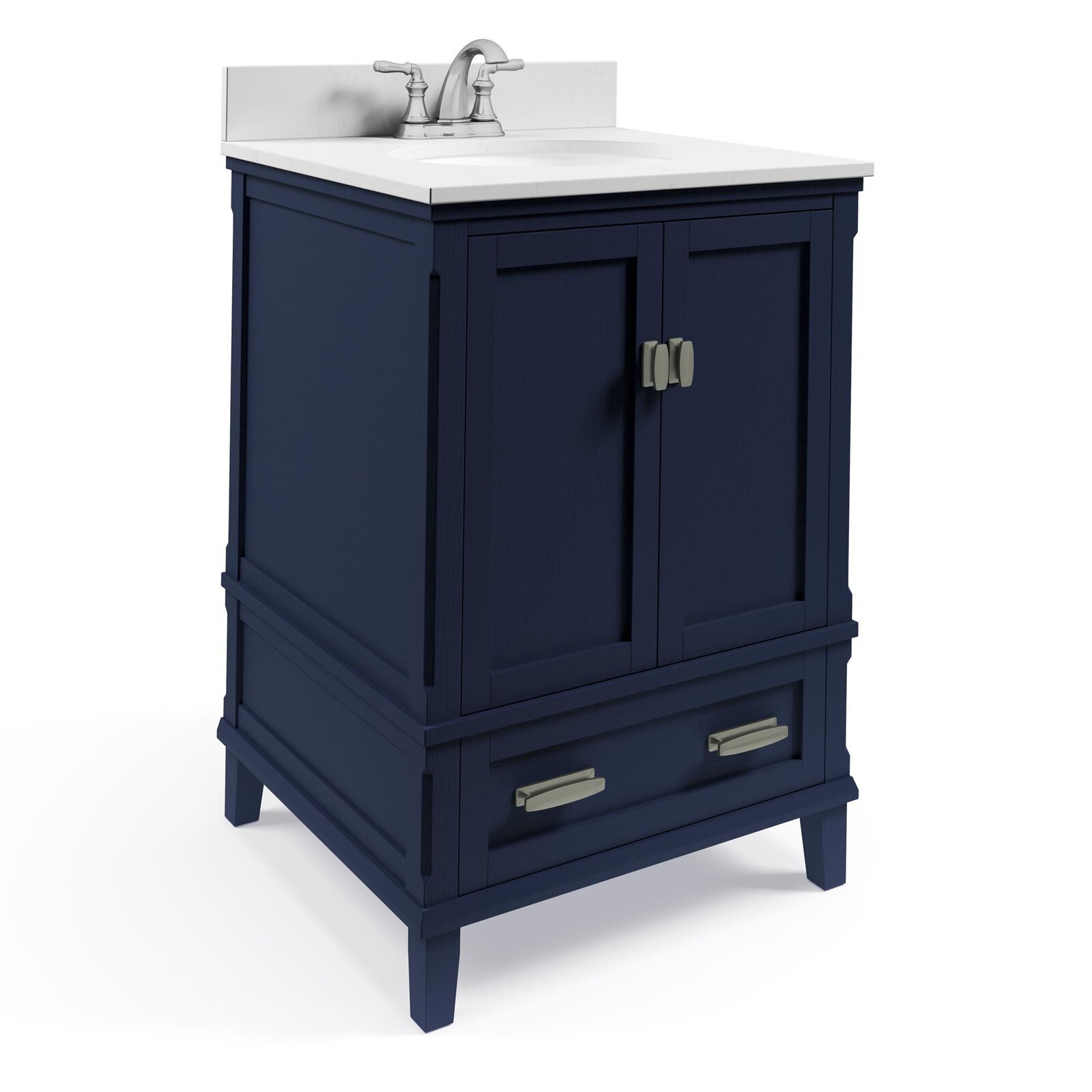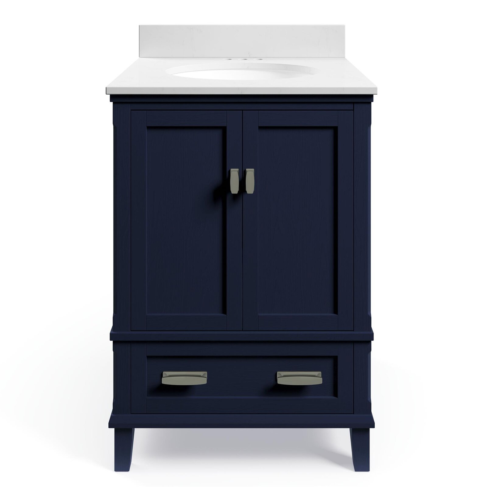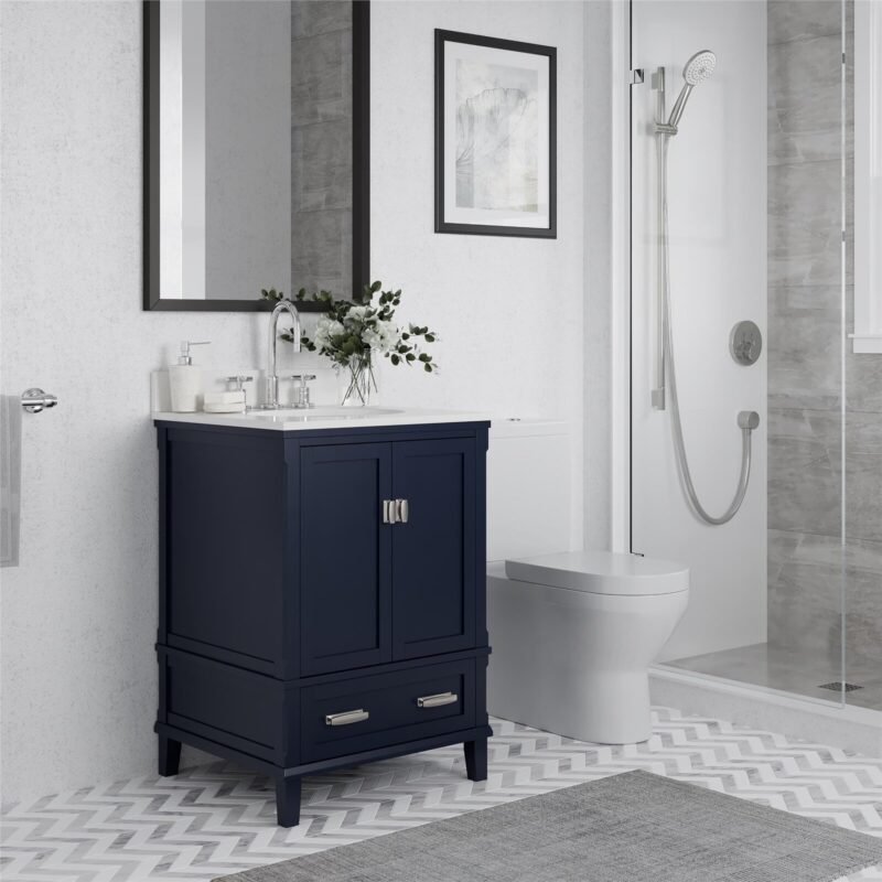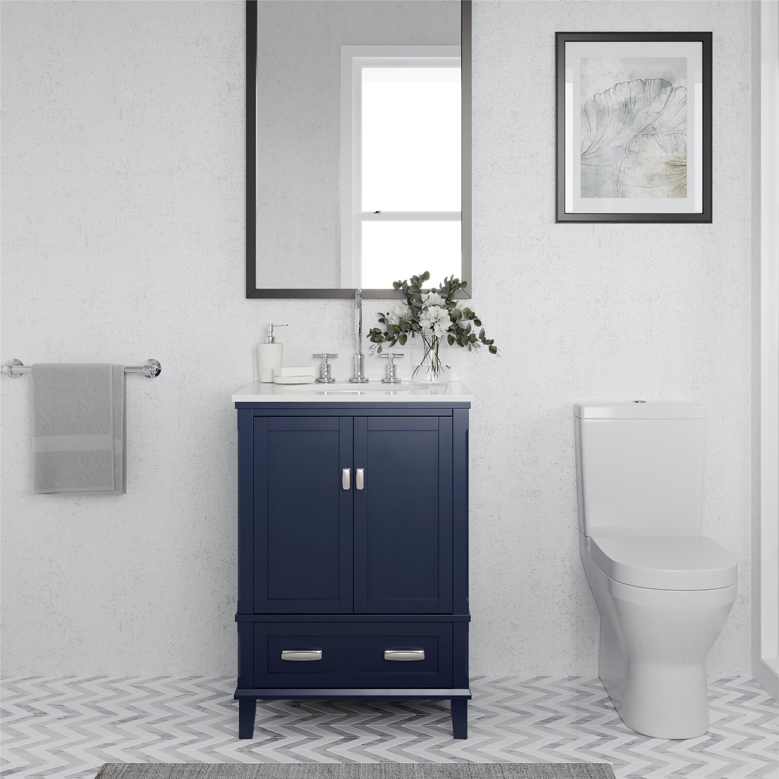 The classic clean lines and elegant styling of the DHP Optum 24” Bathroom Vanity will infuse your bathroom with a calming, light, and airy feel. Designed to enhance a smaller size bathroom with a strong, rectangular silhouette, the Optum delivers a clean, contemporary look with a big character in a compact size. The countertop is made from a durable engineered stone that is resilient and non-porous to provide a surface that is easy to clean. Included is a pre-installed oval sink with pre-drilled holes positioned for a center-set faucet. The vanity design also includes a back panel cut out for easy access to plumbing! Equipped with two shaker-style closing soft-closing cabinet doors with gleaming nickel-finished hardware, and a lower solid wood drawer to stow all your bathroom essentials, the Optum features a lacquer coating for extra durability. Add an inviting and refreshing touch to your fashionable bathroom with the DHP Optum 24″ Bathroom Vanity.