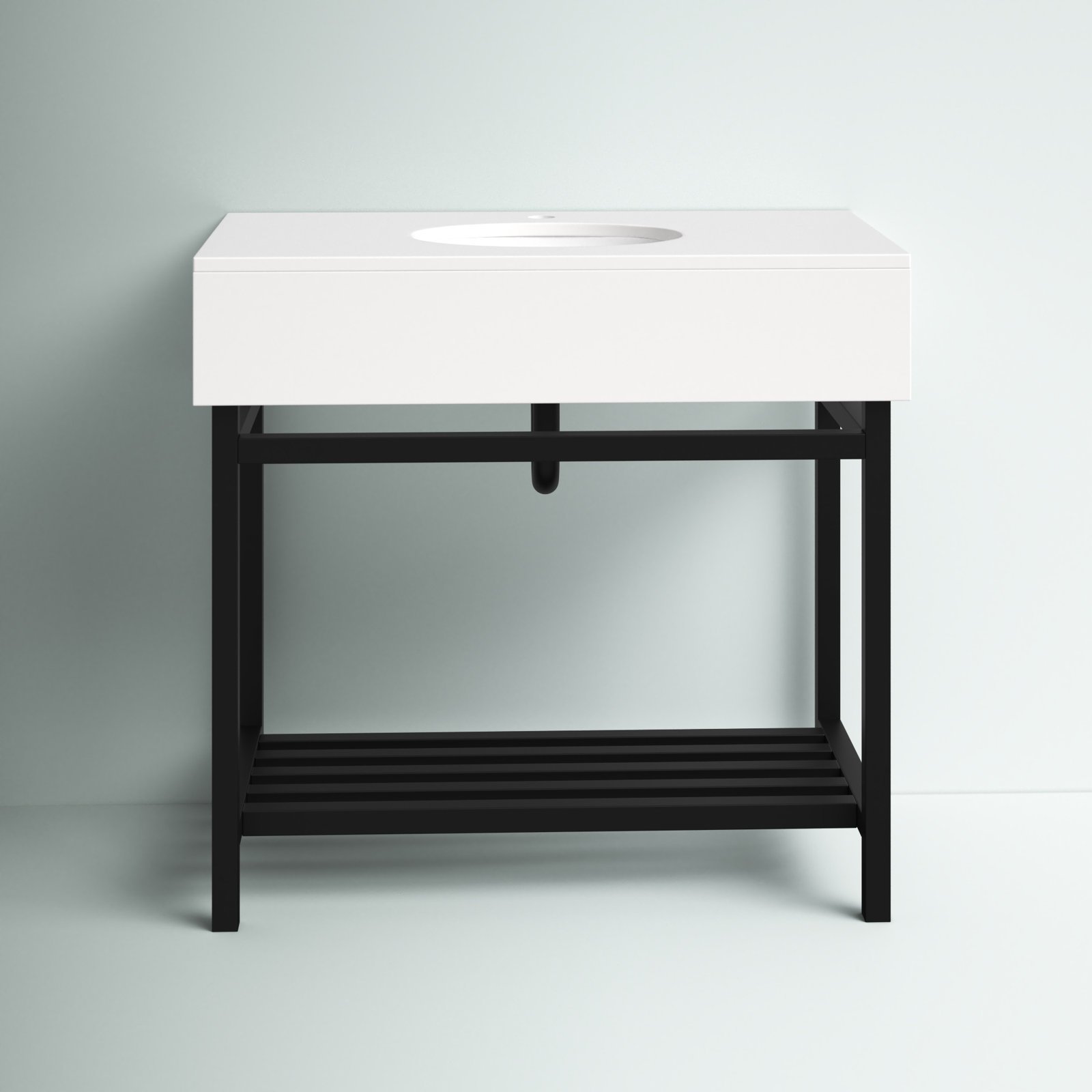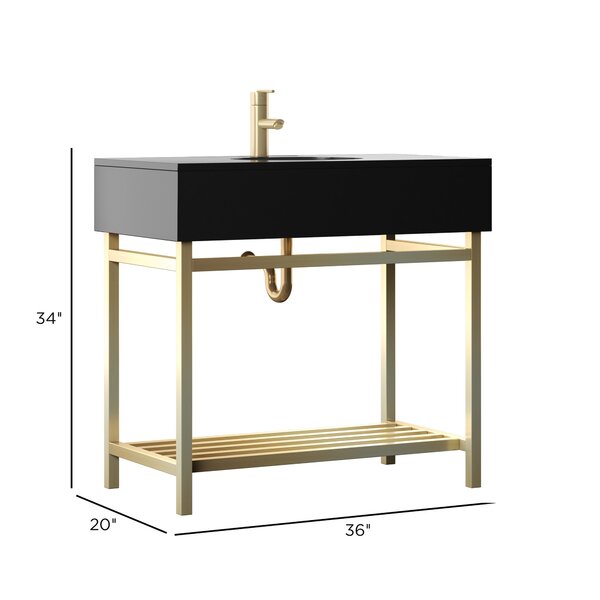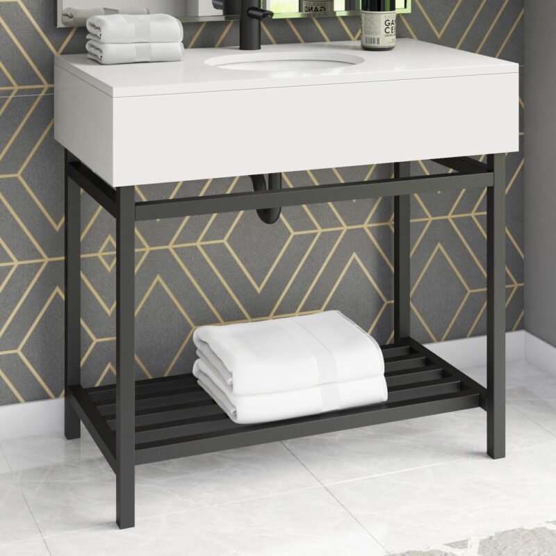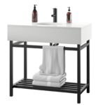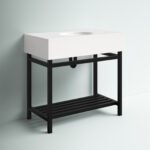This single bathroom vanity combines modern style with an industrial feel that we love. Made with a metal base, it features a ceramic top with a rectangular silhouette set over an open-frame base. A sleek, clean-lined shape shows off a two-tone finish, while a slatted shelf on the bottom provides plenty of space for folded towels or extra toilet paper. Plus, it comes with a ceramic undermount sink and pre-drilled holes for a faucet of your choice (sold separately). At 36″ wide, it’s ideal for smaller bathrooms.