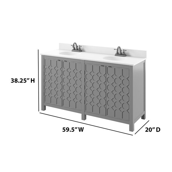 This freestanding double vanity brings a streamlined silhouette and geometric pattern to your powder room. It has an engineered wood base and a stone backsplash and countertop. Its two oval, undermount sinks are made from stone in a white finish. Store bathroom essentials in its two soft-close, double-door cabinets, each with a built-in interior shelf. This vanity features a glam, playful design of repeating octagons across its cabinet doors – reminiscent of honeycomb. It measures 59.5” wide and 20” deep, with cabinet hardware included and the faucets and mirror sold separately.