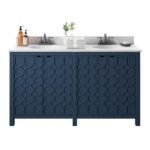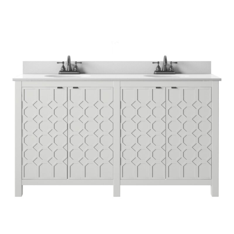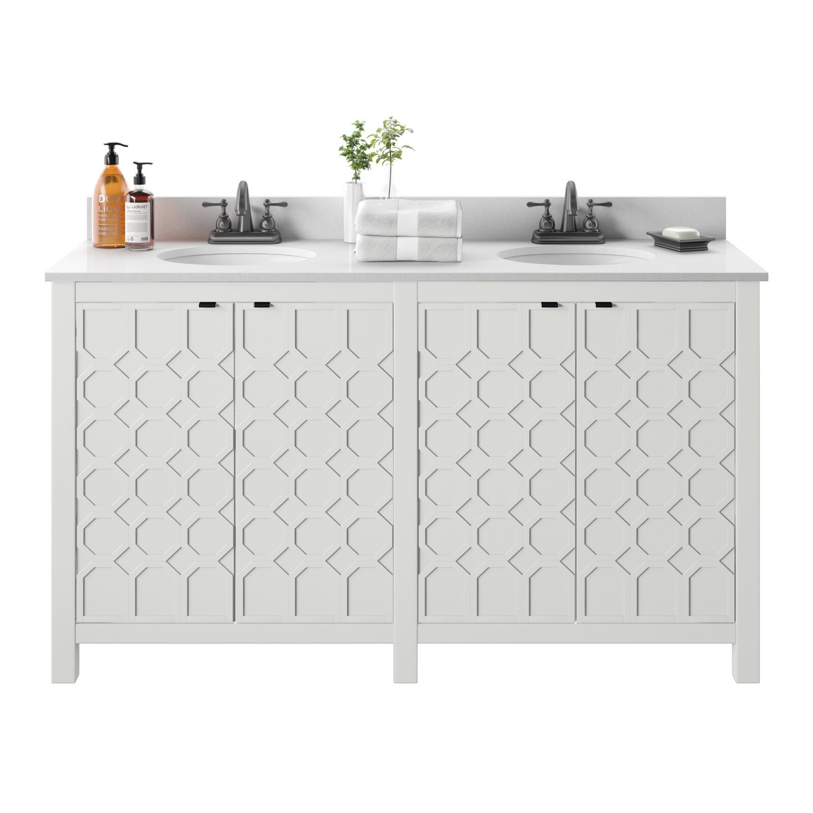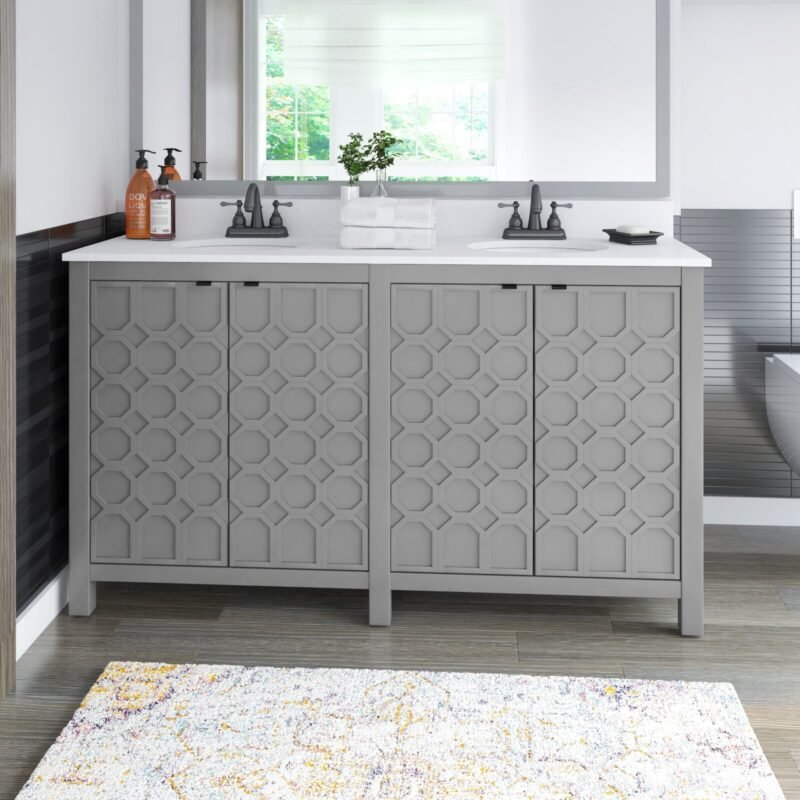 This freestanding double vanity brings a streamlined silhouette and geometric pattern to your powder room. It has an engineered wood base and a stone backsplash and countertop. Its two oval, undermount sinks are made from stone in a white finish. Store bathroom essentials in its two soft-close, double-door cabinets, each with a built-in interior shelf. This vanity features a glam, playful design of repeating octagons across its cabinet doors – reminiscent of honeycomb. It measures 59.5” wide and 20” deep, with cabinet hardware included and the faucets and mirror sold separately.