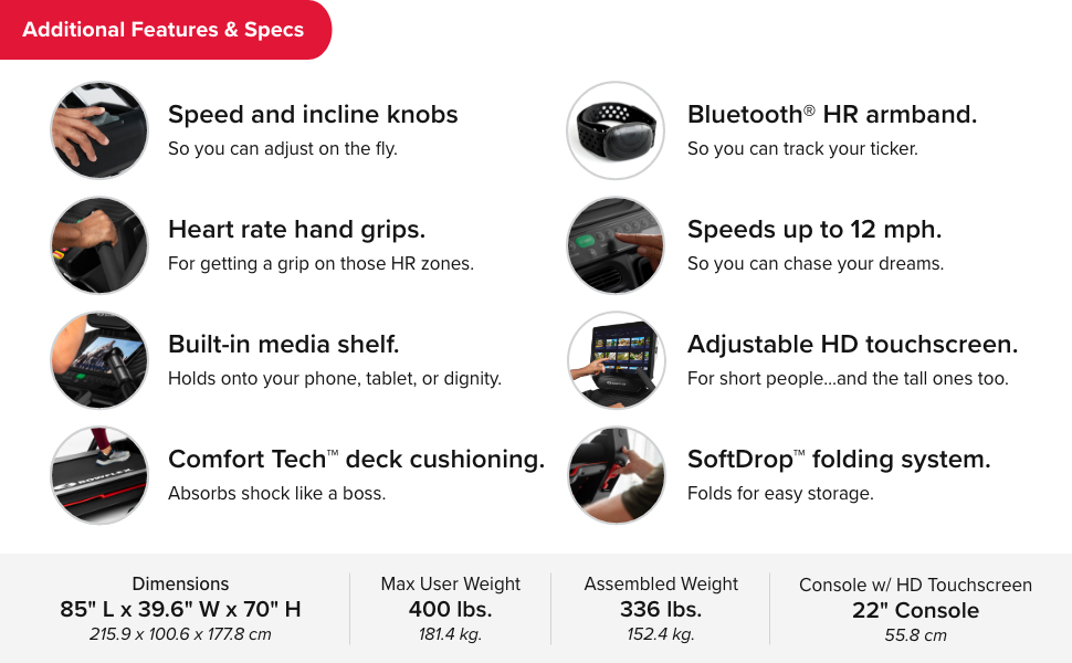 - 22″ x 60″ running path with Comfort Tech deck cushioning and speed up to 12 MPH