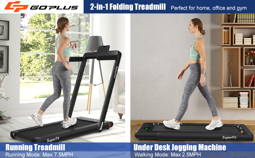 - INNOVATIVE 2-IN-1 FOLDING TREADMILL — Compared to ordinary treadmills, our 2-in-1 Superfit treadmill has 2 modes to meet your different sports needs. When the riser is folded, it can be used as a jogging machine at a speed of 0.6MPH-2.5MPH, when the handrail is raised, the running speed is 0.6MPH-7.5MPH, and the speed unit could be switched between mile and km in APP.