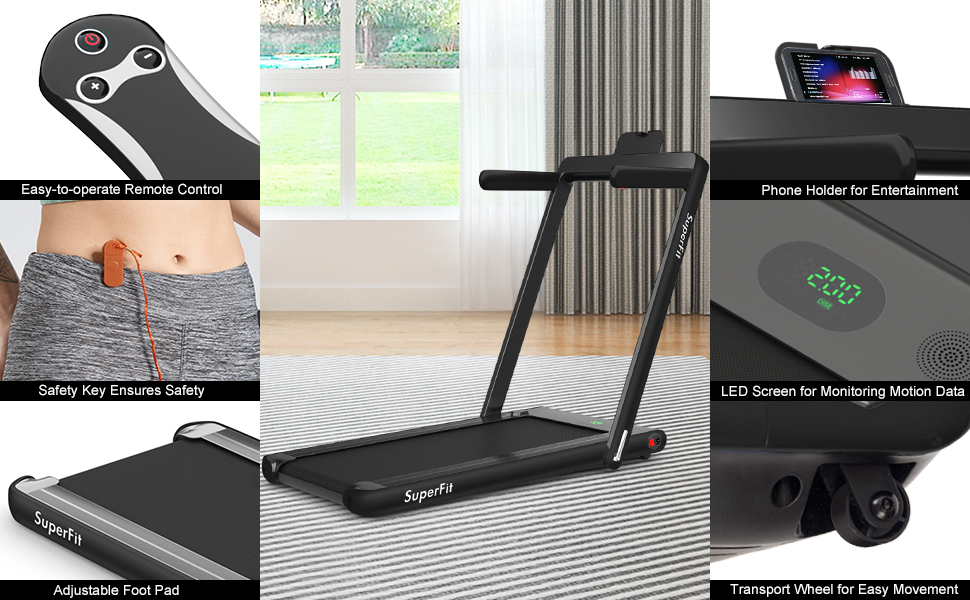 - Package Included: 1x Treadmill 1x Remote Control 1x Phone Holder 1x Safety Key