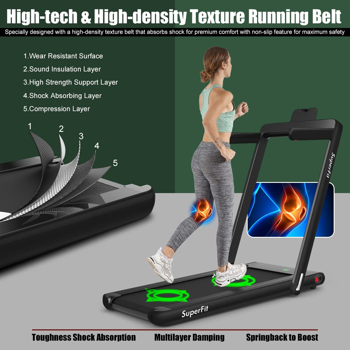 - POWERFUL 2.25HP — With a powerful and ultra-quiet 2.25HP motor, this Superfit treadmill allows you to walk or run without disturbing others, making it ideal for home and office use. With a sturdy and durable steel frame and multi-layer shield design, it’s shock-absorbing and noise-reducing, making your running quieter, safer and more comfortable.