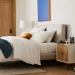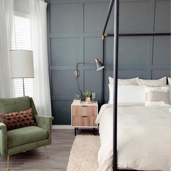 - Lofty metal legs pop against the wood frame.