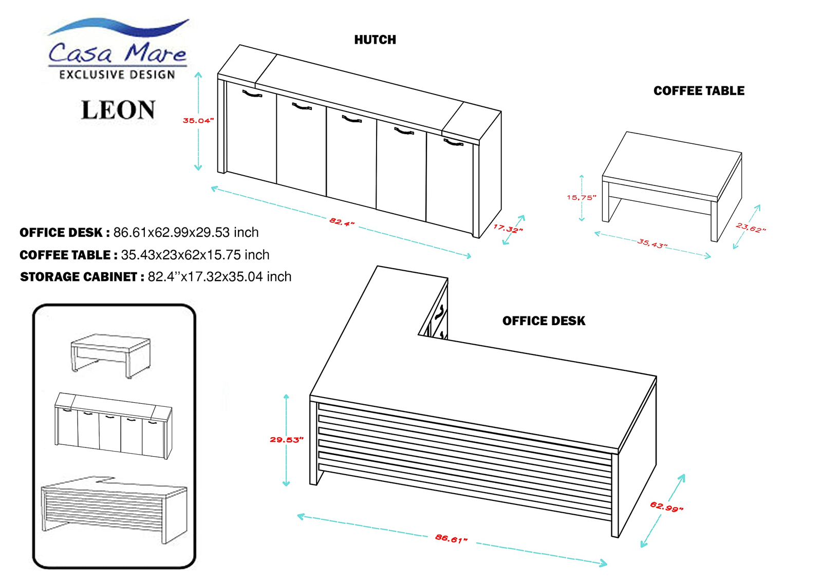 - ✔ Office Desk: L:86.61 W:62.99 H:29.53 (inches) / 404.22 LB, Coffee Table: L:35.43 W:23.62 H:15.75 (inches) / 73.30 LB, Storage Cabinet: L:82.4 W:17.32 H:35.04 (inches) / 254.37 LB