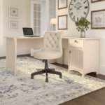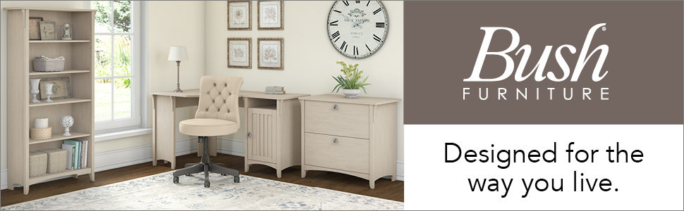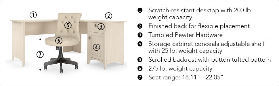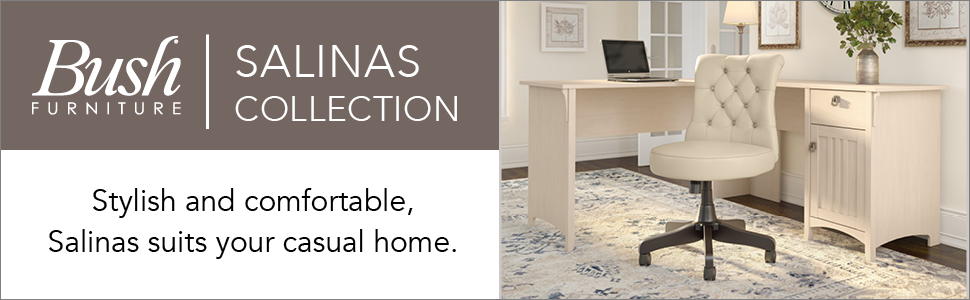 Create a home office inspired by Mission styling. The Bush Furniture salinas 60W L shaped desk with mid back tufted office chair offers a comfortable workspace solution with quality designs you’ll love. Tapered legs, curved base rails and decorative wood accents give the corner desk a casual look that blends seamlessly with cottage and farmhouse decor. The desktop provides a 60 Inch work surface in either direction, allowing plenty of room to spread out with a computer and paperwork. Save space by placing the L desk in a corner or take advantage of the finished back to face any direction you’d like. A storage cabinet with one adjustable shelf keeps items of various sizes Easily accessible, and small office supplies like writing utensils and Notepads can be stored in the box drawer. Your choice of appealing Antique White, cape Cod gray and vintage Black finishes with tumbled pewter hardware brings a country charm to any space. The office chair, highlighted by bonded leather or fabric upholstery with a button tufted Pattern and scrolled backrest, provides a natural complement to the salinas desk. An espresso wood cover disguises a heavy duty steel base and adds to the chair’s casual appearance. Foam cushioning gives the seat A medium-firm feel while the swivel chair’s Height and tilt tension can be adjusted to meet your own personal preferences. This home office furniture set is tested to meet ANSI/Soho standards for safety and performance and is backed by a 1 year .