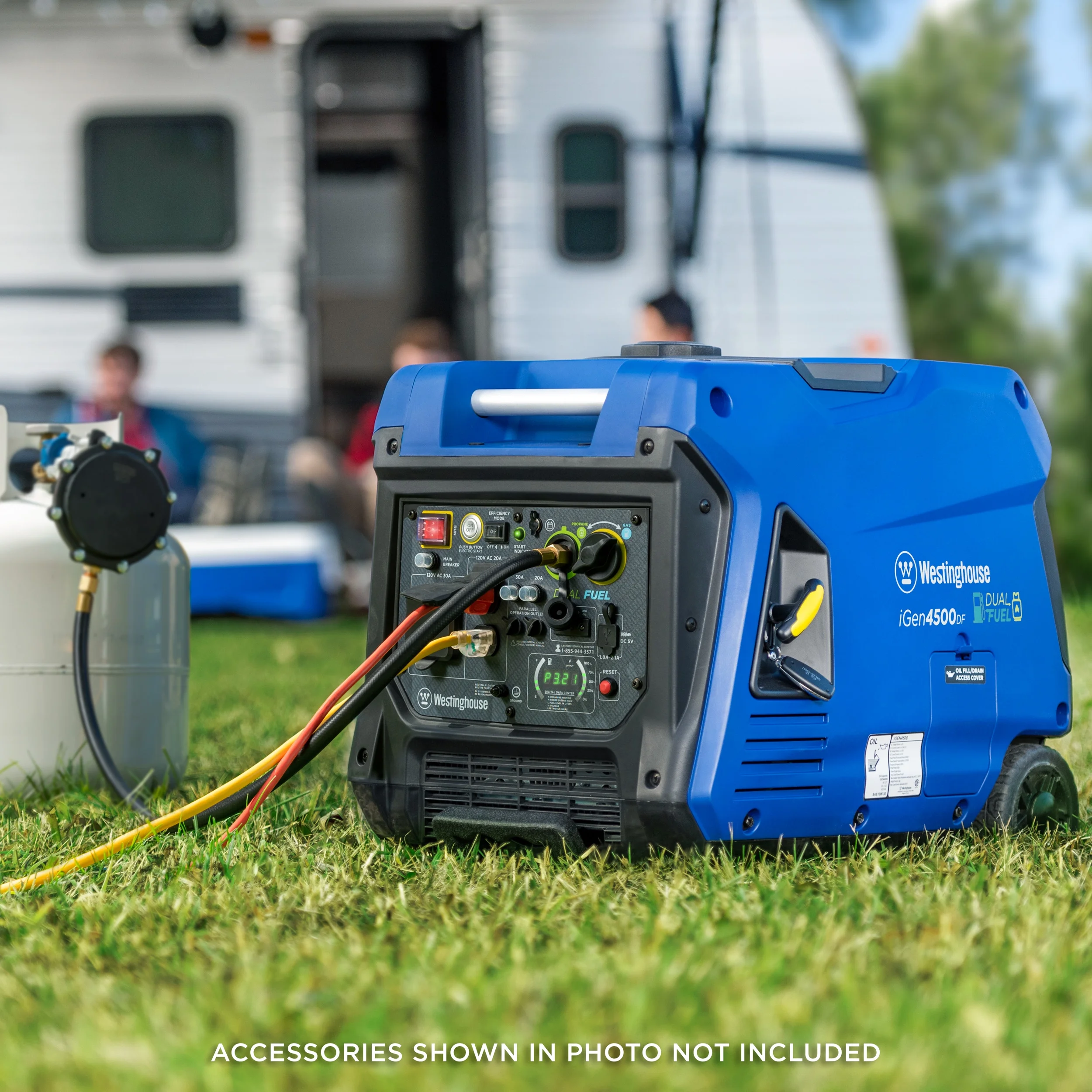 The Westinghouse iGen4500DF Dual Fuel Inverter Generator is a premium power solution to meet your portable power needs whether you’re camping or on the go. With a TT-30R RV Ready Outlet, two 20A household outlets, and built-in USB ports, this generator is ideal for recreational activities or as an emergency backup source. It’s engineered for maximum fuel efficiency with variable engine speed to produce only the power you need at any given time, running up to 18 hours on a 3.4-gallon gas tank. As a dual fuel generator, the iGen4500DF operates on gasoline or propane for versatility wherever you are. Conveniently built with Push-Button Electric Start and wireless remote start for easy ignition and has an LED Data Center with an automatic rotating digital display to keep you up to date with real-time information. At less than 3% THD, the iGen4500DF is perfect for running sensitive electronics like LCD/plasma televisions, laptops, tablets, or mobile devices that require clean, stable power. It features a lightweight, compact design with wheels and an extendable suitcase-style handle, making this model effortlessly more portable than traditional generators. The iGen4500DF is ensured by a 3-year limited warranty from a nationwide service network and lifetime technical support.